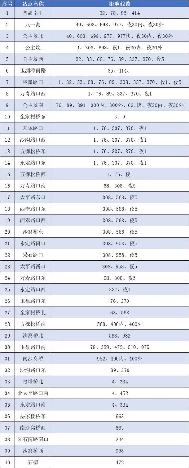 地铁:在前期已封闭莲花桥站的基础上,玉泉路站、五棵松站、万寿路站、公主坟站四个地铁站不封站、只封南侧出口(其中公主坟站封西侧出口)。