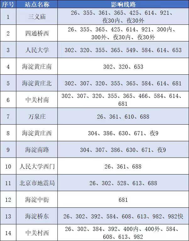 公交:途经海淀区中关村西区及友谊社区管控区的14个站位采取甩站措施,涉及35条公交线路。