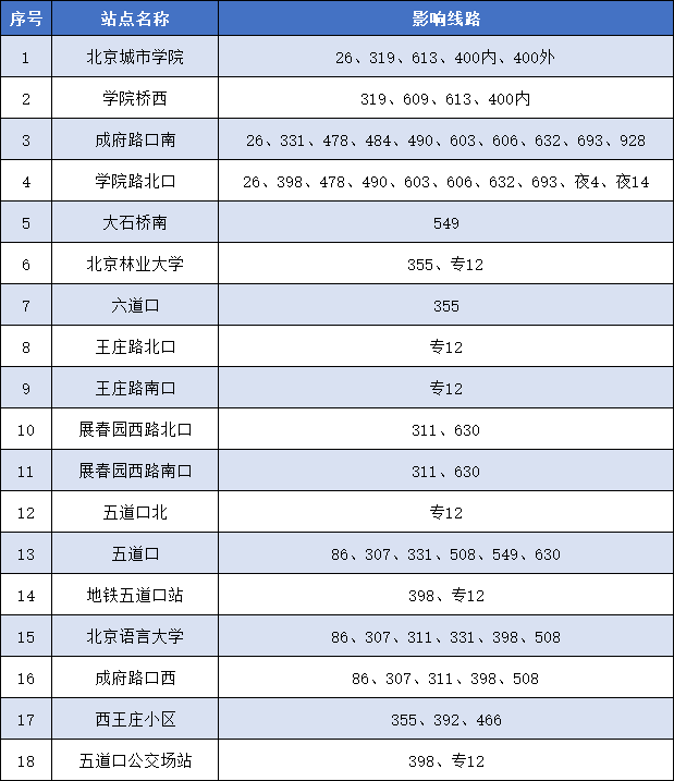 公交:途经海淀区优胜大厦管控区的18个站位采取甩站措施,涉及28条公交线路。