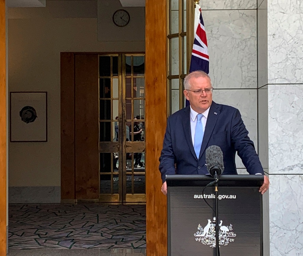 2021年1月8日,澳大利亚总理莫里森在堪培拉出席新闻发布会(手机拍摄)。新华社记者岳东兴摄