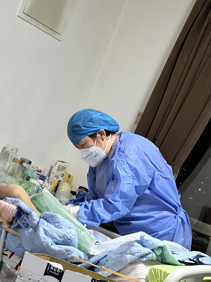 对于没有实操过的护理内容,聂理会要求自己在最短的时间掌握。“比如插胃管和尿管属于护理内容,我就立刻上网学习,快速掌握要点,再打电话给我们医院高年资的护士确认。”回忆起第一次给小区一名患者下胃管,没有实操经验的聂理会心里还是有一丝忐忑。“还好,从准备材料到下管、清洁,一切进行得都很安全、顺利,患者也很满意,我也更有信心了。”