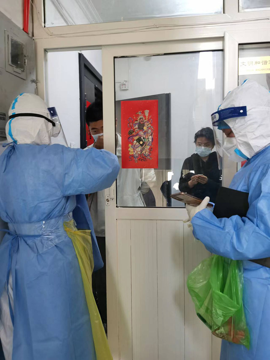 小区病例最多时有6例,有两栋楼被封控,被划为高风险区。为了节省时间、提高上门采样效率,志愿队的队员们都是小跑着工作。