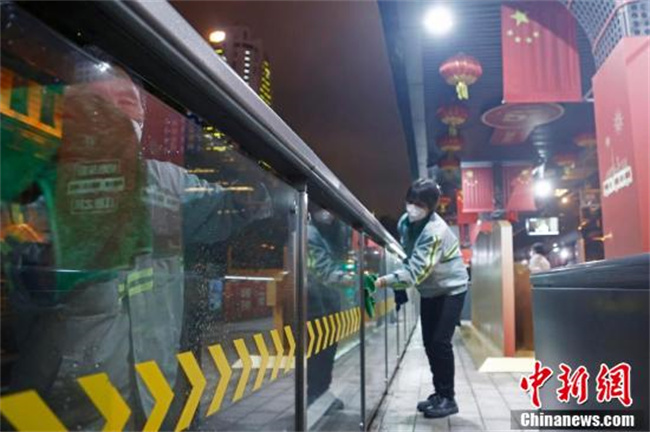 5月20日晚,71路中运量公交车的部分司机和保洁人员正在对外滩站进行站台清洁。据上海市交通委主任于福林介绍,上海拟从5月22日起逐步恢复跨区公共交通。