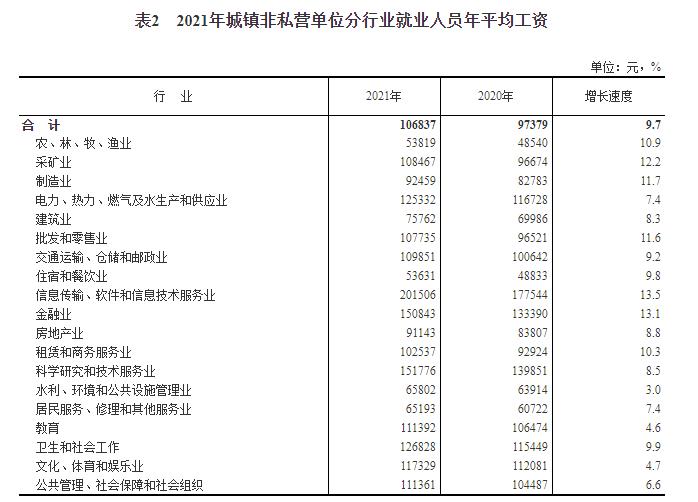 国家统计局数据显示,2021年全国城镇非私营单位就业人员年平均工资为106837元,首次超过10万元,比上年增长9.7%,增速比2020年提高2.1个百分点,扣除价格因素实际增长8.6%