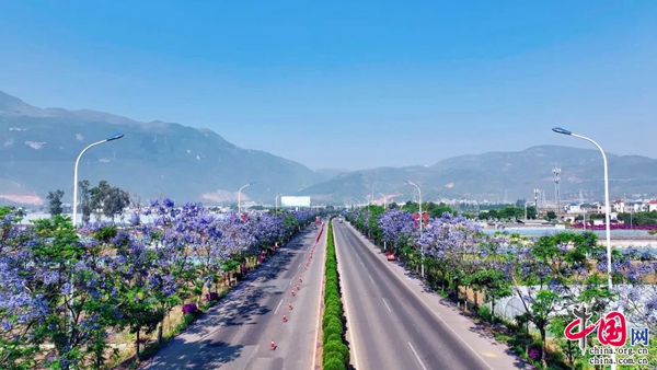 个旧依然沉浸在紫色的“海洋”中。位于大屯街道的蓝花楹进入花期绽放于枝头,道路两旁蓝紫色的花影已悄然蔓延,蓝花楹以蓝紫色的典雅、清凉姿态驱走炎热和单一的色彩,给活力四射的大屯新区增添了一份浪漫静谧。