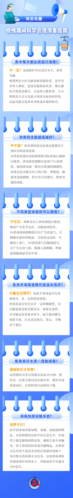 疫情期间,消毒是防范病毒传播的有效方式之一,但不合理的消毒方式却可能危害人们健康或对环境造成损害。居家消毒如何做?哪些问题要注意?一起来看国家卫生健康委员会关于疫情期间科学合理消毒的暖心小贴士。