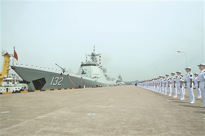 上午9时许,伴随着嘹亮的军乐声,编队舰艇依次驶离码头。甲板上,任务官兵精神抖擞,整齐列队,挥手告别。