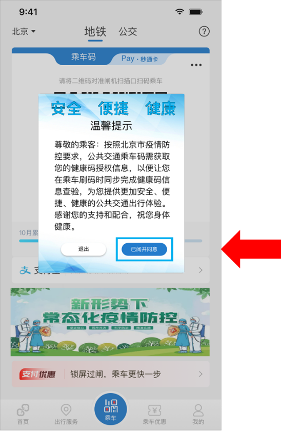 使用亿通行APP、支付宝APP、银联云闪付APP、招商银行APP,以及与北京地铁互通的上海、天津、广州、呼和浩特城市的地铁APP乘车码乘客,按照所使用APP自动弹窗提示,点击“已阅并同意”按钮,即可完成授权关联健康码。