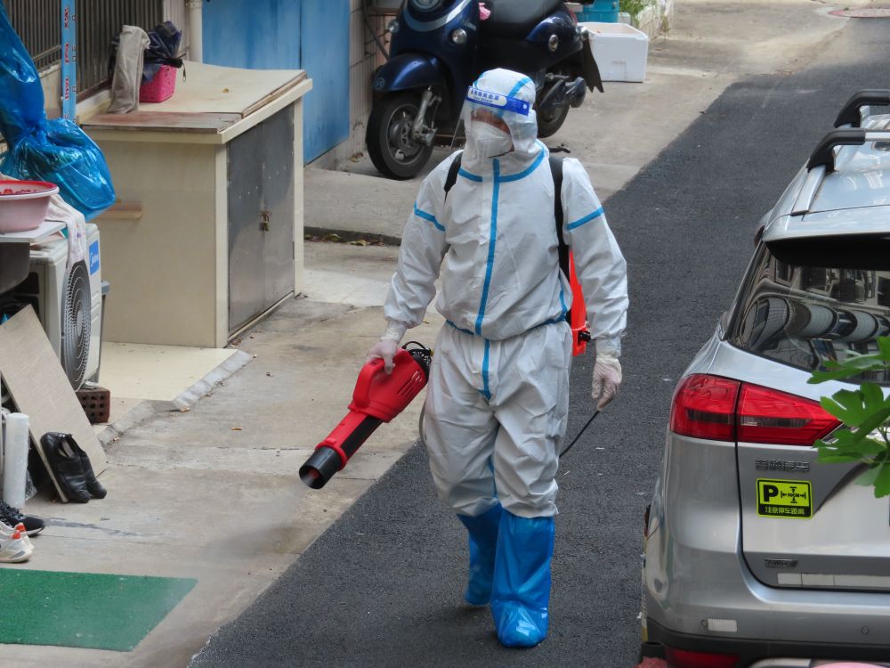 工作之余,作为科技馆运维中心观众服务部副部长,曹艳充分发挥善于沟通的优势,利用检测间隙,向居民们科普消毒知识,解释核酸检测的必要性,并和志愿者们一起对弄堂开展环境消杀,向小区广播平台提供科普素材。