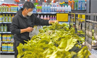 随着流通网络日益完善,县乡商品供给更加丰富。图为在安徽阜阳市临泉县一家超市,消费者正在选购蔬菜。