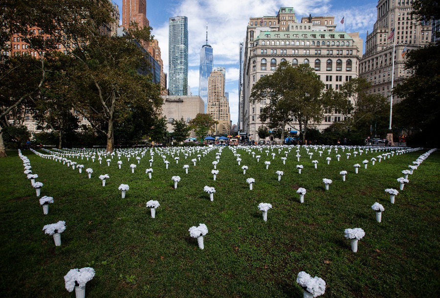这是2021年10月8日在美国纽约炮台公园内拍摄的为悼念枪支暴力遇难者摆放的白色瓶花。(新华社记者王迎摄)