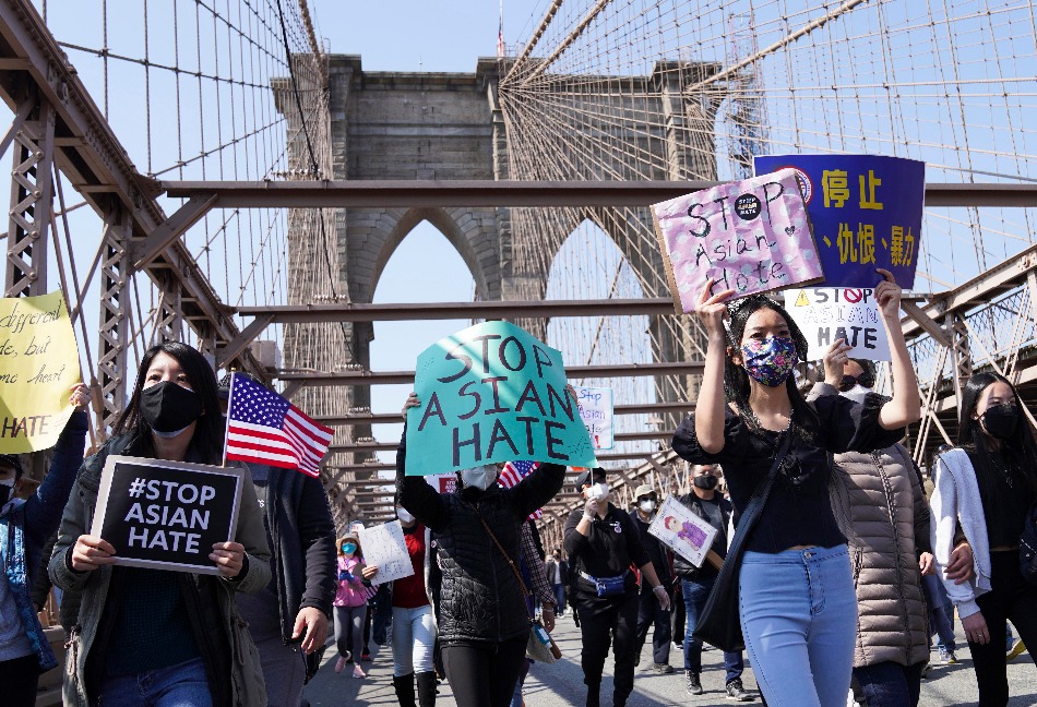2021年4月4日,反对亚裔仇恨的游行队伍走过美国纽约的布鲁克林大桥。(新华社记者王迎摄)