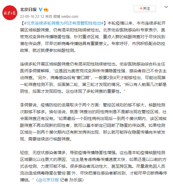 本轮疫情以来,北京市连续多轮开展区域核酸筛查,仍有混采阳性陆续被检出。北京佑安医院感染科专家表示,奥密克戎变异株传播隐匿性强,针对重点区域、重点人群的核酸筛查对于尽快找到潜在传染源,尽早切断病毒传播链具有重要意义。专家呼吁,市民积极配合防控政策,就近就便参加核酸检测。