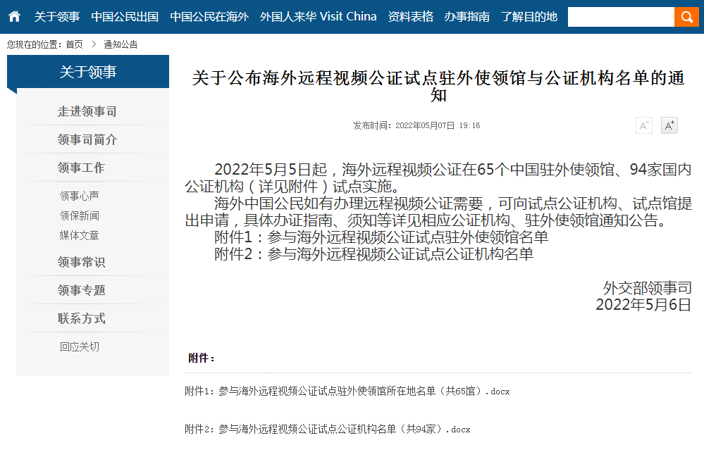 自2022年5月5日起,海外远程视频公证在65个中国驻外使领馆、94家国内公证机构试点实施。海外中国公民如有办理需要,可向试点公证机构、试点使领馆提出申请。目前,相关工作正在有序推进。(详见链接:http://cs.mfa.gov.cn/gyls/lsgz/fwxx/202205/t20220507_10683082.shtml)
