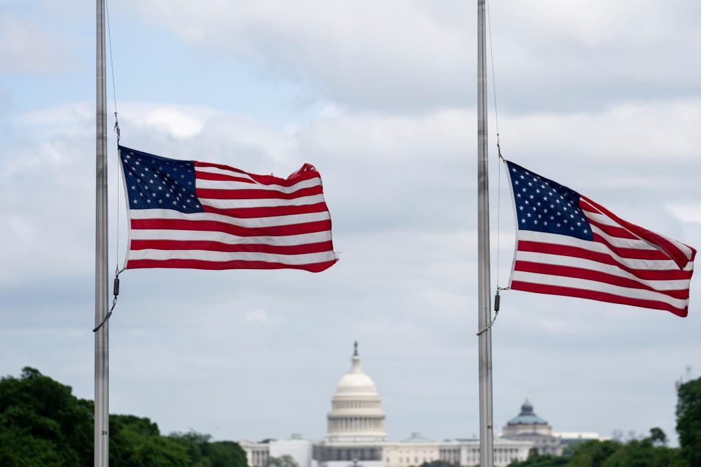5月12日,在美国首都华盛顿,华盛顿纪念碑周围的美国国旗降半旗悼念新冠逝者。(新华社记者刘杰摄)