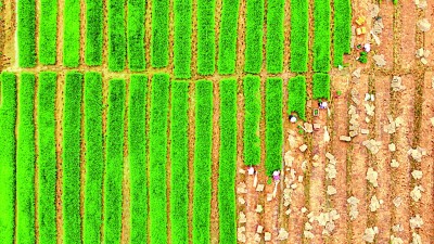 崇左市扶绥县岜盆乡岜伦村农民在早稻育秧田里起秧苗。卢文斐摄/光明图片