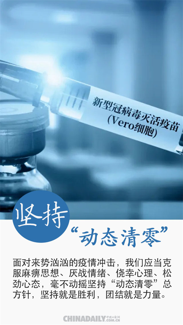 当前全球疫情仍处于高位,我国疫情呈现点多面广、规模化与散发聚集性疫情并存、多点多源多链等特点。当此之际,我们尤需保持清醒头脑,深刻认识抗疫斗争的复杂性和艰巨性。克服麻痹思想、厌战情绪、侥幸心理、松劲心态,毫不动摇坚持“动态清零”总方针,决不能让来之不易的疫情防控成果付之东流。