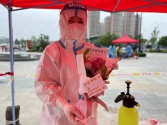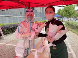 5月12日上午,在四里河街道万科中心核酸检测点,来自周边花店的店主和工作人员自发为一线抗疫白衣天使送上精美的花束,致敬持续为所有市民提供免费核酸检测服务的“天使们”,向他们表达深深的祝福和感谢!