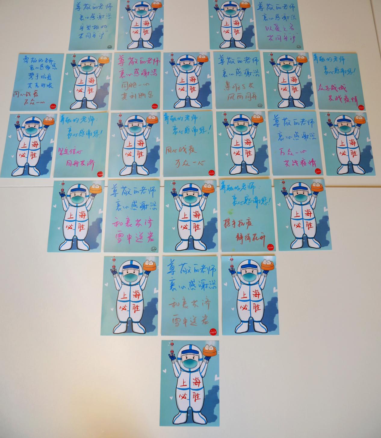 驻守上海新国博方舱医院的7个外省市援沪医疗队护理人员收到一份特殊礼物:“私人定制”手绘感谢信和一束向日葵——画面上,“大白”托起“小笼包”与“东方明珠”,那是上海及上海人民的像征,背面写着感谢与祝福。