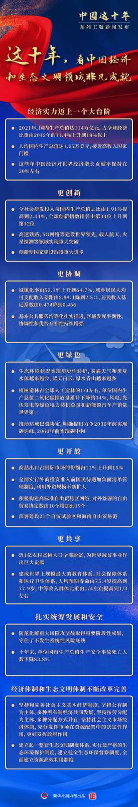 这是我国经济实力又迈上一个大台阶的十年,这是扎实推进创新发展、协调发展、绿色发展、开放发展、共享发展的十年,这是扎实统筹发展和安全的十年,这是经济体制和生态文明体制不断改革完善的十年……