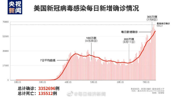 【最后一小时,美股大跳水!美国疫情加重,NBA威少新冠检测呈阳性】当地时间7月13日,美股在当天交易日最后一小时从高点回落,三大股指走势分化,标普500指数与纳指创盘中新高后双双收跌,特斯拉盘中一度暴涨逾16%,但最终收跌逾3%,苹果、亚马逊、奈飞等科技股在创下新高后也悉数收跌。近期美国单日平均新增确诊病例数约为6万例,医学专家警告称,目前的疫情比以往任何时候都严重。随着美国开始了经济和社会活动的重启工作,多地疫情形势再度严峻了起来。目前,至少35个州已经出现了确诊病例激增,美国有线电视新闻网(CNN)报道,几乎每100个美国人就有一人感染。当地时间7月13日,根据美国约翰斯·霍普金斯大学实时数据,截至美东时间7月13日下午5点34分(北京时间14日凌晨5点34分),美国新冠病毒感染确诊人数达到了3352696人,新冠病毒感染相关死亡案例达到了135512例。该数据较24小时前相比,新增感染确诊63908人,新增死亡394例。疫情肆虐下已经有不少各界知名人士中招。NBA著名球星拉塞尔·威斯布鲁克于当地时间7月13日,通过社交媒体表示,其新冠病毒检测呈阳性,目前感觉良好,并处于自我隔离状态。(LX)