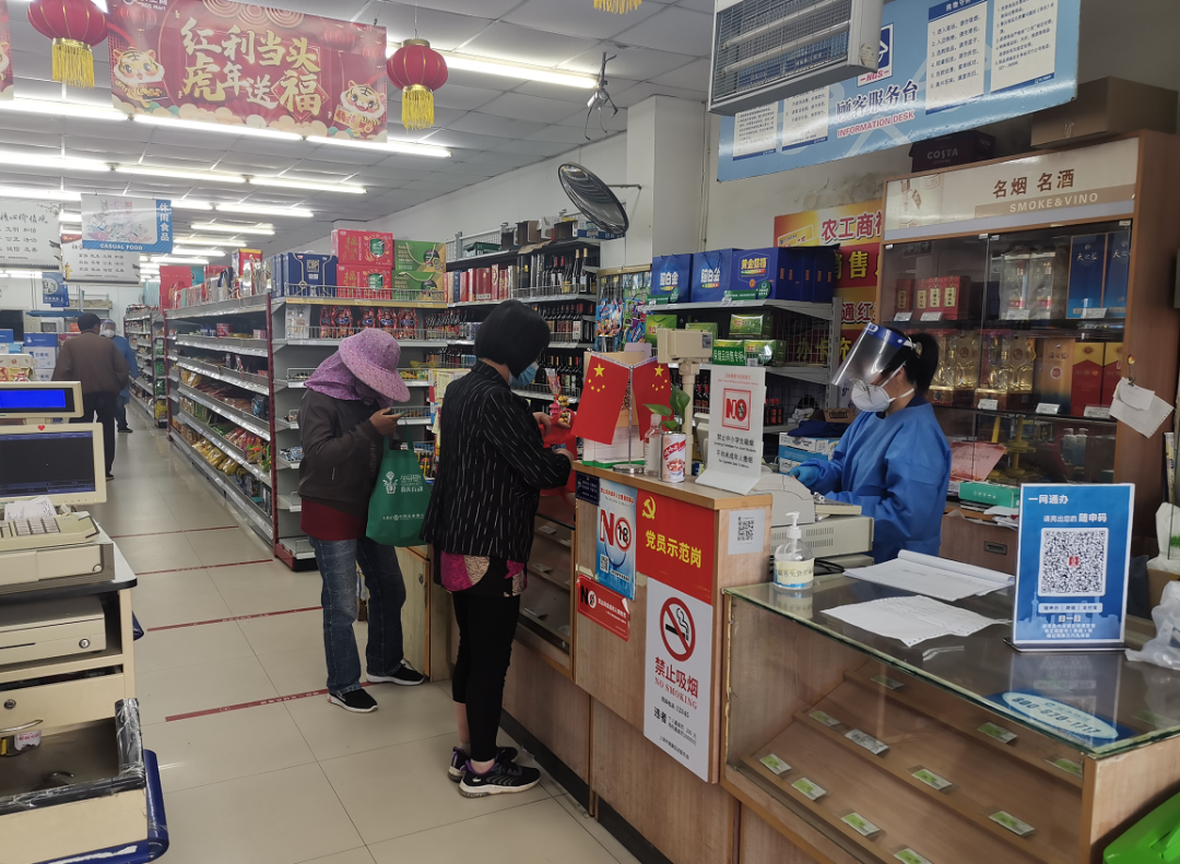 5月9日,在崇明港沿镇华联超市港沿一店入口处,市民们佩戴口罩,保持两米安全距离,有序排队。在志愿者的引导下,大家扫描场所码并使用“数字哨兵”进行测温、核验、身份登记,然后凭购物票进入超市采购,现场秩序井然。