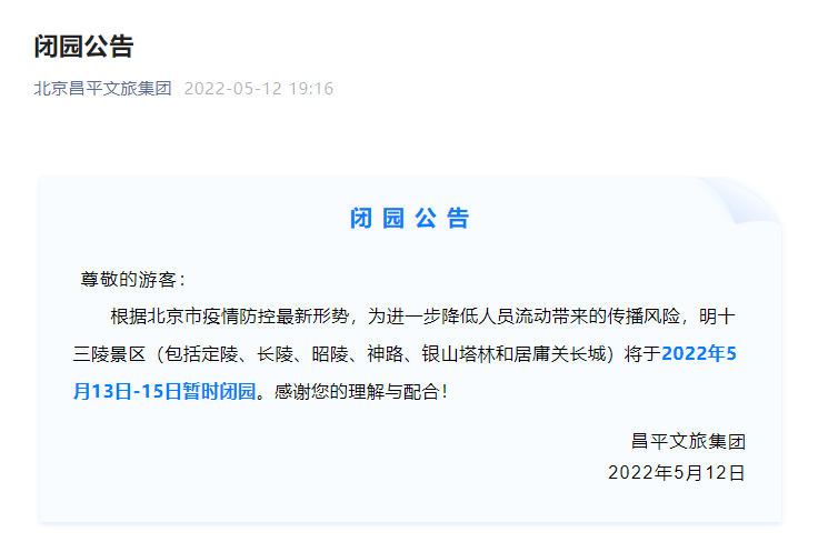据北京昌平文旅集团官微消息,根据北京市疫情防控最新形势,为进一步降低人员流动带来的传播风险,明十三陵景区(包括定陵、长陵、昭陵、神路、银山塔林和居庸关长城)将于2022年5月13日至15日暂时闭园。
