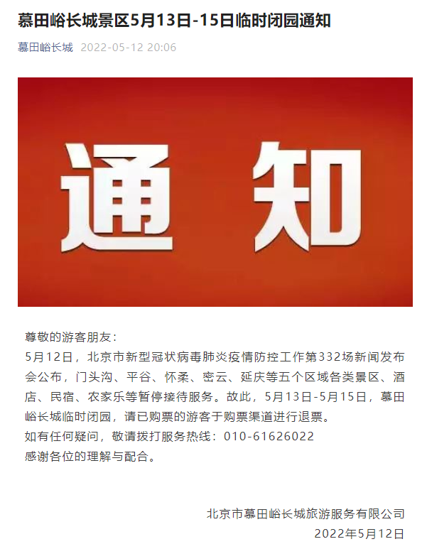 据“慕田峪长城”微信公众号消息,5月12日,北京市新型冠状病毒肺炎疫情防控工作第332场新闻发布会公布,门头沟、平谷、怀柔、密云、延庆等五个区域各类景区、酒店、民宿、农家乐等暂停接待服务。5月13日—5月15日,慕田峪长城临时闭园,已购票的游客于购票渠道进行退票。