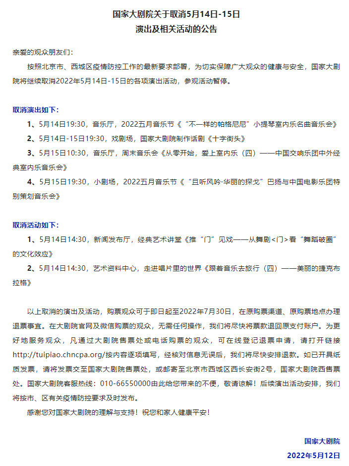 据“国家大剧院”微信公众号消息,按照北京市、西城区疫情防控工作的最新要求部署,为切实保障广大观众的健康与安全,国家大剧院将继续取消2022年5月14日—15日的各项演出活动,参观活动暂停。取消的演出及活动,购票观众可于即日起至2022年7月30日,在原购票渠道、原购票地点办理退票事宜。