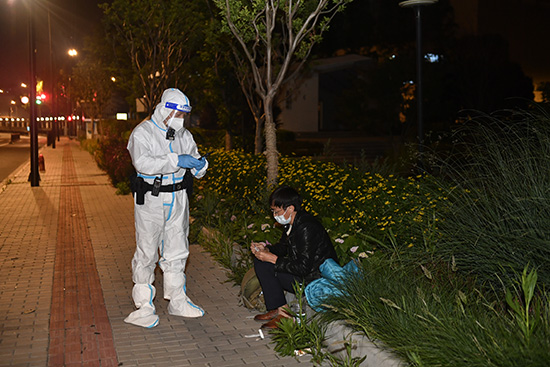 5月9日晚,长宁分局民警巡逻至北翟路枫林绿地附近时,见路边坐着一名戴眼镜的男子,身旁还有被子等物品。经过询问,民警得知该男子张先生3月份来沪打工,求职无果又突遇疫情,自4月中旬开始在公园、高架下空地、桥洞等处过夜。经查验核酸报告并现场抗原检测正常后,民警将张先生送至长宁区救助站安置。在救助站,张先生向民警表示愿意成为一名志愿者为上海抗疫出一份力。10日一早,经过规定程序后,他如愿在北新泾地区一小区内开始了志愿者工作。