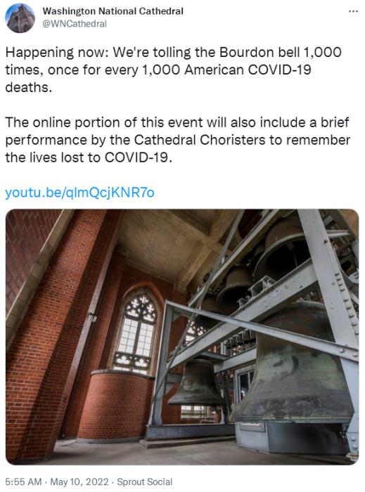当地时间5月9日,美国华盛顿国家大教堂以1000次鸣钟,表达对该国登记在册、死于新冠疫情的100万名逝者的哀悼。