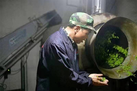 当晚,走进老吴茶叶加工厂看到,厂门口至场内通道上堆放着茶叶鲜草一片碧绿,青翠欲滴,偌大的的场房里机器轰鸣,炉火正旺,茶香四溢。场房内工人们正加班加点,赶制新茶。