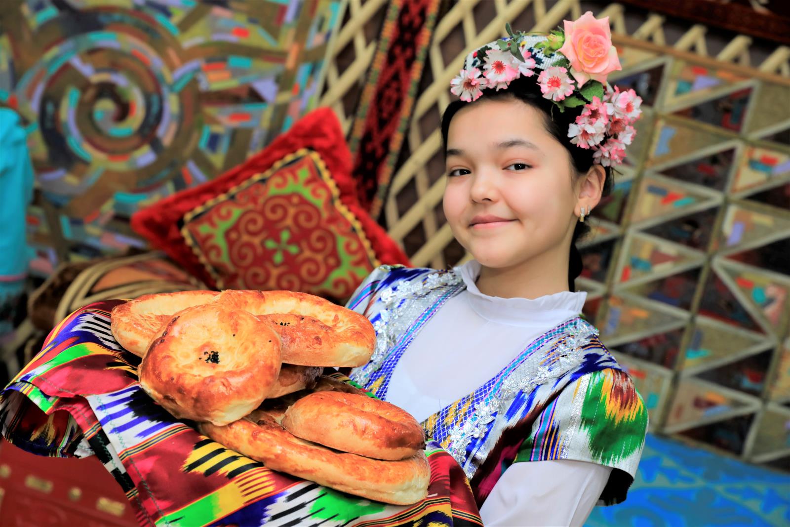 2021年3月19日,一名身着民族服饰的哈萨克斯坦女孩在努尔苏丹展示传统美食,庆祝即将到来的纳乌鲁斯节。新华社发 奥斯潘诺夫 摄