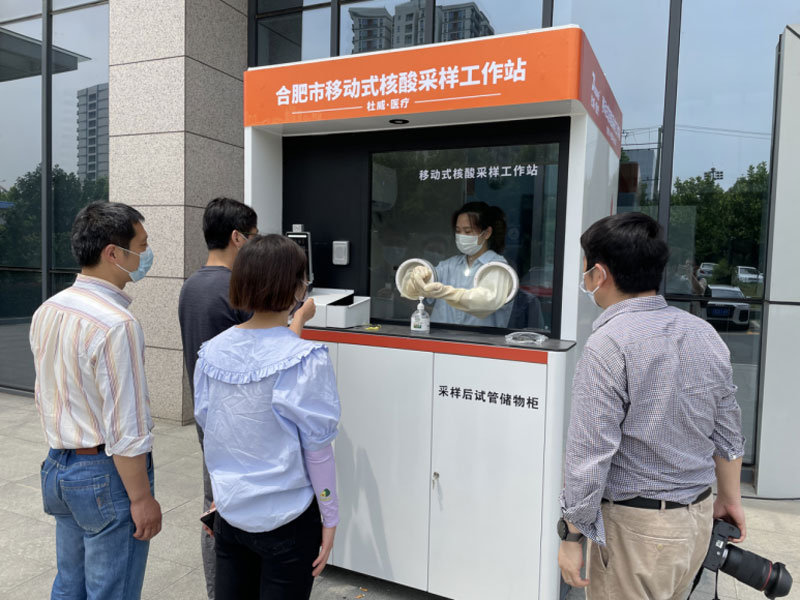 杜威智能的移动式核酸采样小屋(工作站),是一款集体温测量、核酸采样、病毒消杀等功能于一体的产品,既提高了核酸采样效率又保证了采样人员安全。