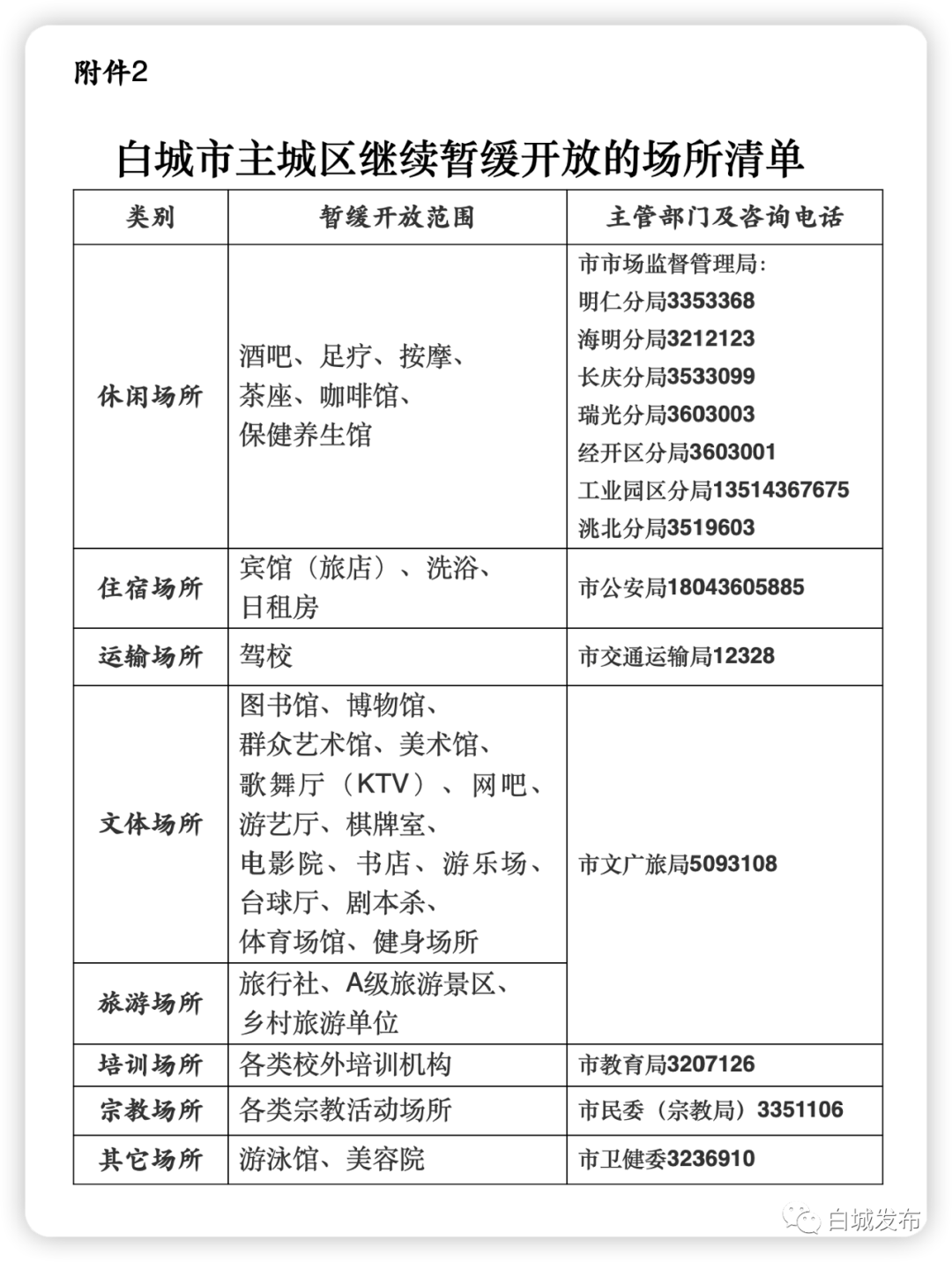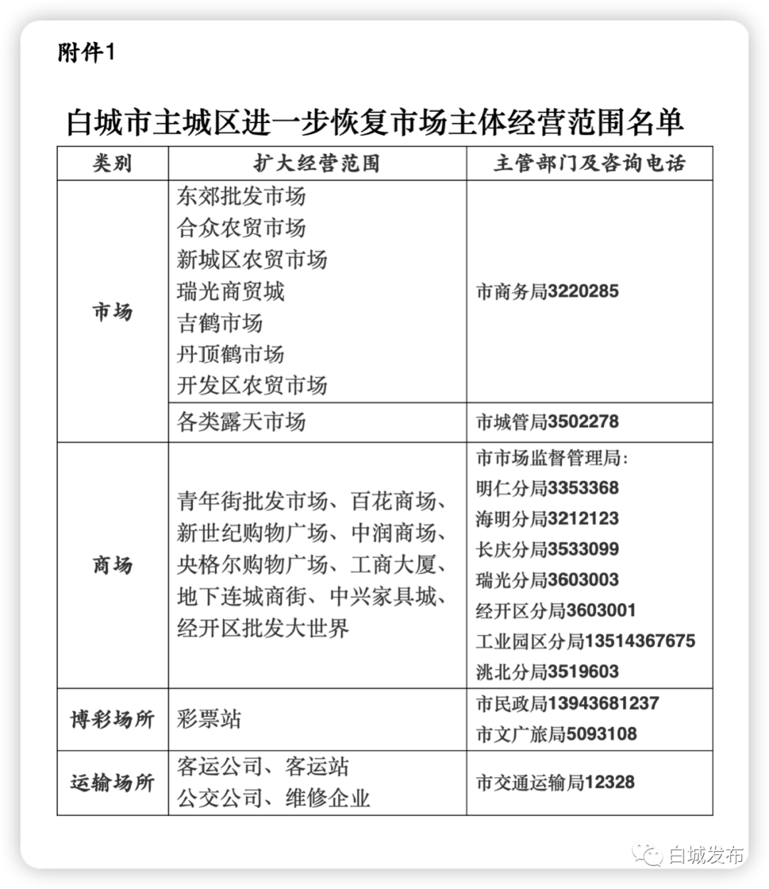 5月10日,据白城发布,为高效统筹疫情防控和经济社会发展,市新冠肺炎疫情防控工作领导小组决定,进一步恢复主城区市场主体经营范围,允许农贸市场、批发市场、露天市场、大型商场、博彩场所、部分运输场所(见附件)履行“申请+报备+承诺”程序后,可在严格落实疫情防控措施的前提下恢复经营。