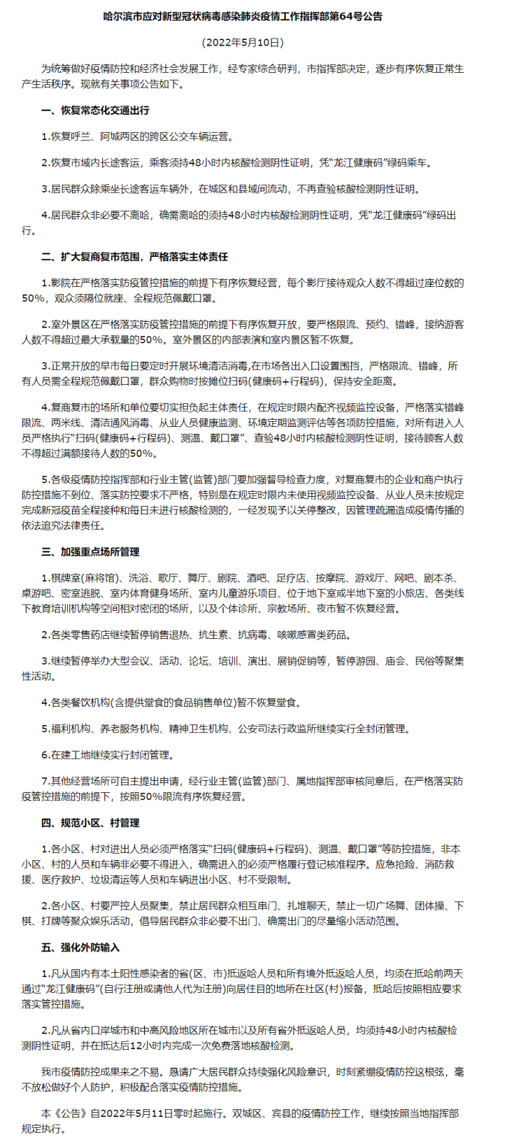 记者了解到,为统筹做好疫情防控和经济社会发展工作,经专家综合研判,哈尔滨市指挥部决定,逐步有序恢复正常生产生活秩序,现就有关事项公告如下。