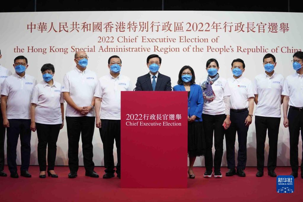 5月8日,李家超当选香港特别行政区第六任行政长官人选。这是李家超(左五)出席新闻发布会。新华社记者 吕小炜 摄