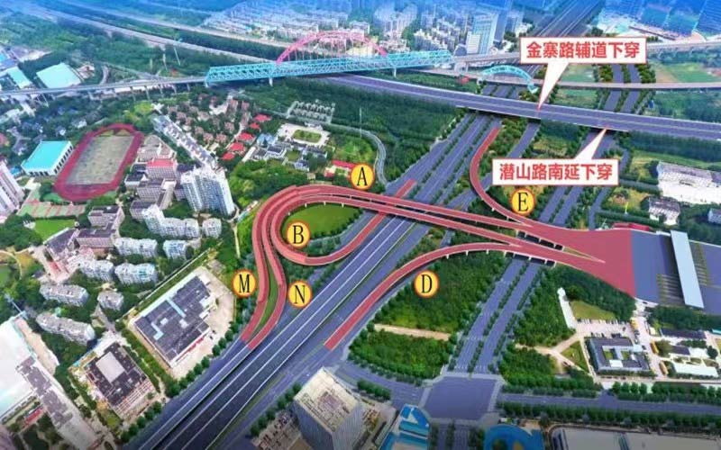 本次改造匝道桥采用“双喇叭”立交互通形式,匝道由现状单车道扩建为双车道。下高速,前往市区方向直接接入金寨路地面主线,前方分流,分别接入高架桥及地面辅路。前往肥西方向通过匝道提前分流,直接接入高架桥及地面辅路。上高速,均通过地面辅路及高架桥下匝道汇流,进入收费站广场。另外,本项目新建了金寨路辅路、潜山路南延两处下穿高速的“路改桥”,既满足金寨路快速化改造的拓宽要求,也为后续打通潜山路断头路预留了条件。工程完工后,能够快速完成绕城高速与金寨路高架桥之间的交通转换,有效提升通行能力缓解拥堵。