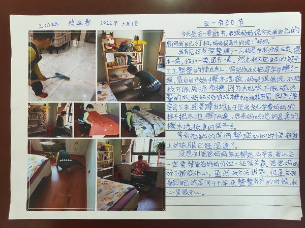 只有亲自参加劳动实践活动才会有真正的收获。孩子们请家长帮忙拍照片、录视频,并通过自己记录劳动日记,创作以“红领巾心向党——我是劳动小能手”为主题的劳动手抄报和绘画作品的方式,记录下劳动过程。