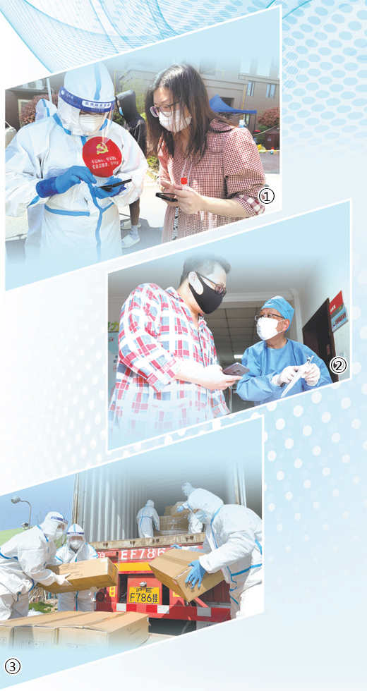 图①:上海市浦东新区惠南镇建欣苑临时党支部党员(左)在核酸检测现场给居民扫码。