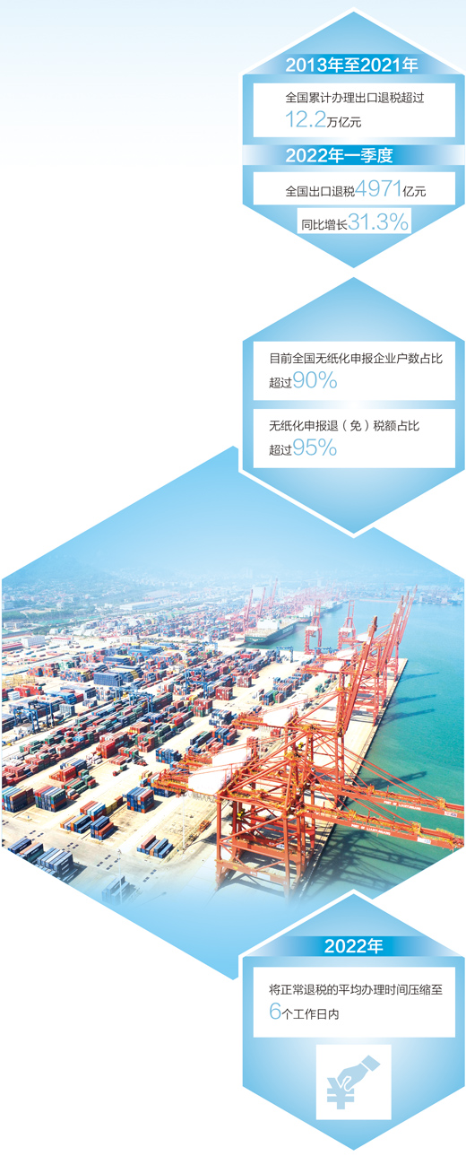近年来,税务总局持续扩大无纸化申报覆盖范围,大幅减轻出口企业申报负担。目前,全国无纸化申报企业户数占比超过90%,无纸化申报退(免)税额占比超过95%;税务总局正会同相关部门研究推出进一步提高出口退税便利度等支持举措,2022年内,正常退税的平均办理时间将压缩至6个工作日内。