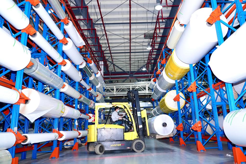 艾利丹尼森(中国)有限公司车间里,工人正在装卸产品。(昆山市融媒体中心供图)