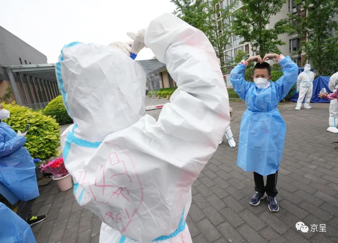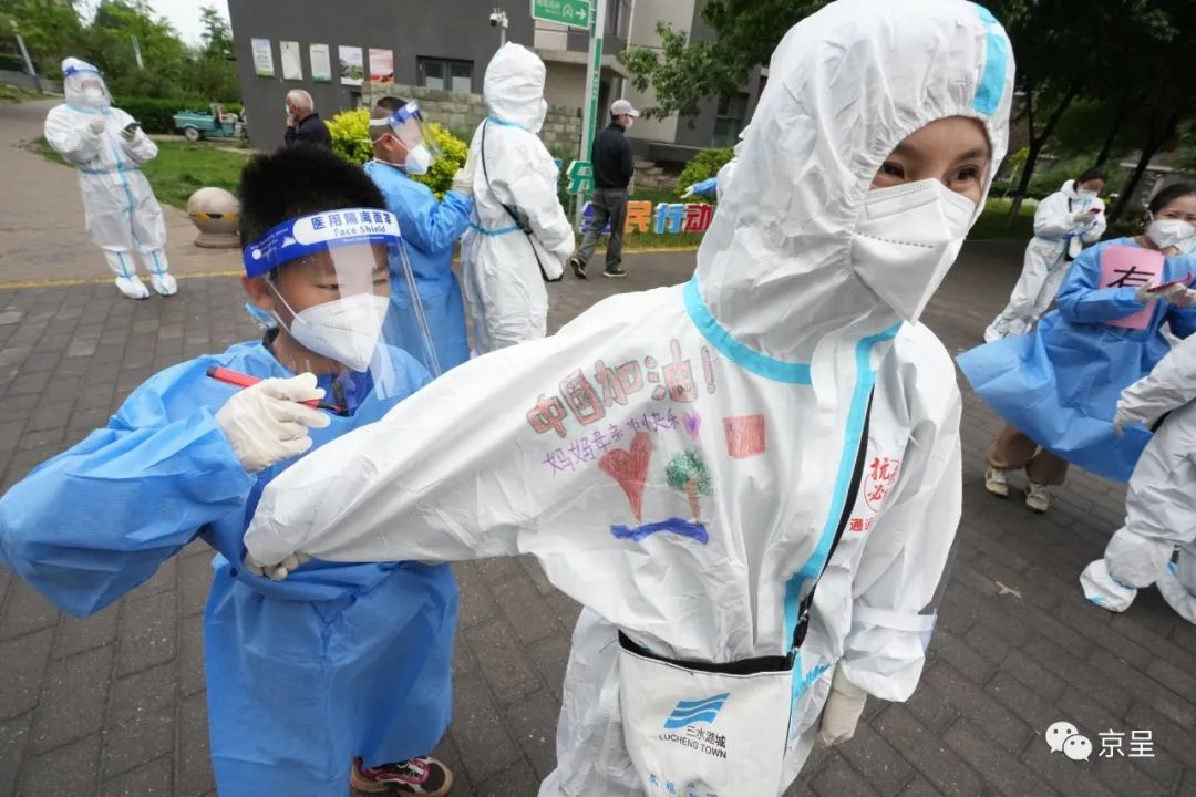 今天上午,通州区通运街道武夷花园紫荆园社区迎来了第9轮区域核酸检测。很多妈妈都在岗抗疫,她们的子女来到核酸采集点,在核酸采集工作开始前,给“大白”妈妈们送上祝福,亲手在妈妈的防护服上写上祝福语。