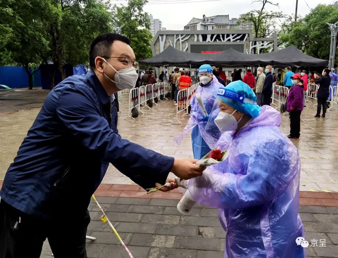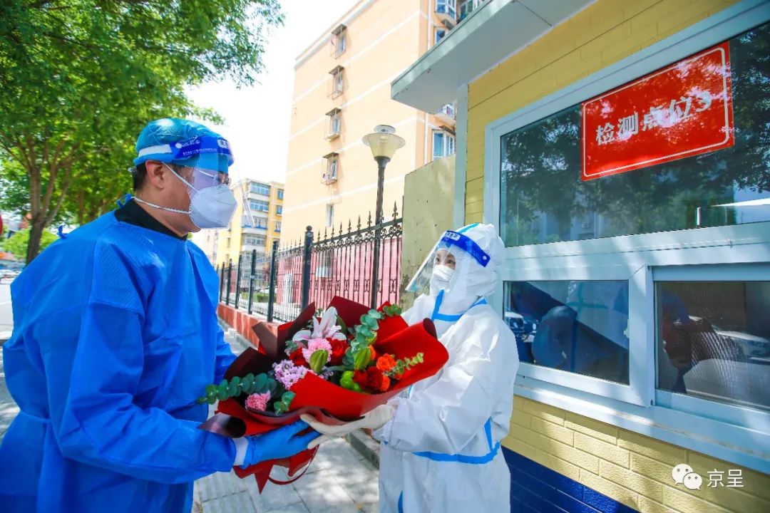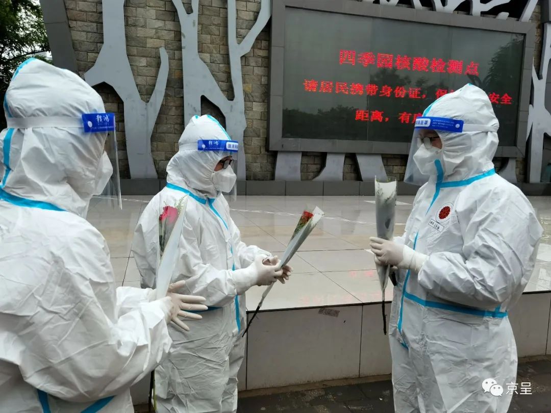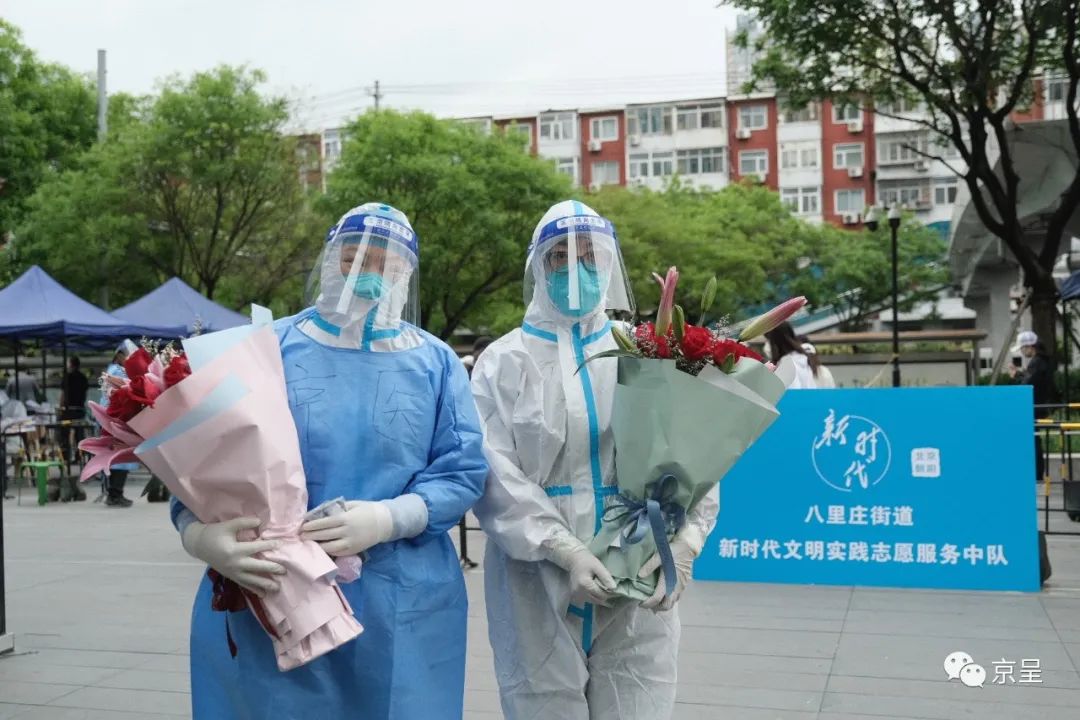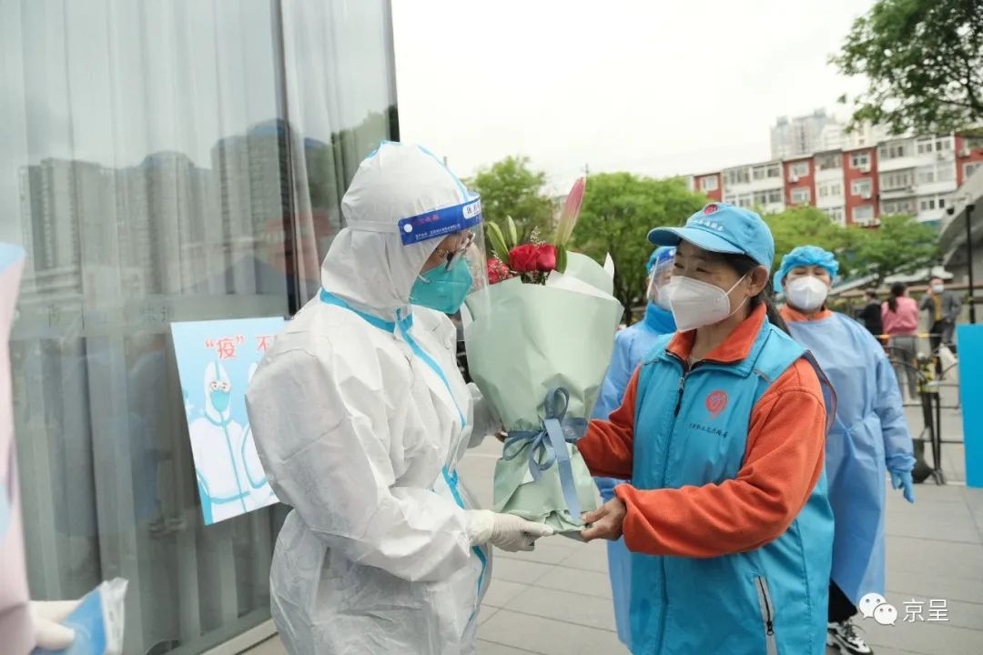 朝阳区八里庄街道万科时代中心采样点,梁会兰爱心服务队为医护志愿者中的妈妈们送上鲜花。