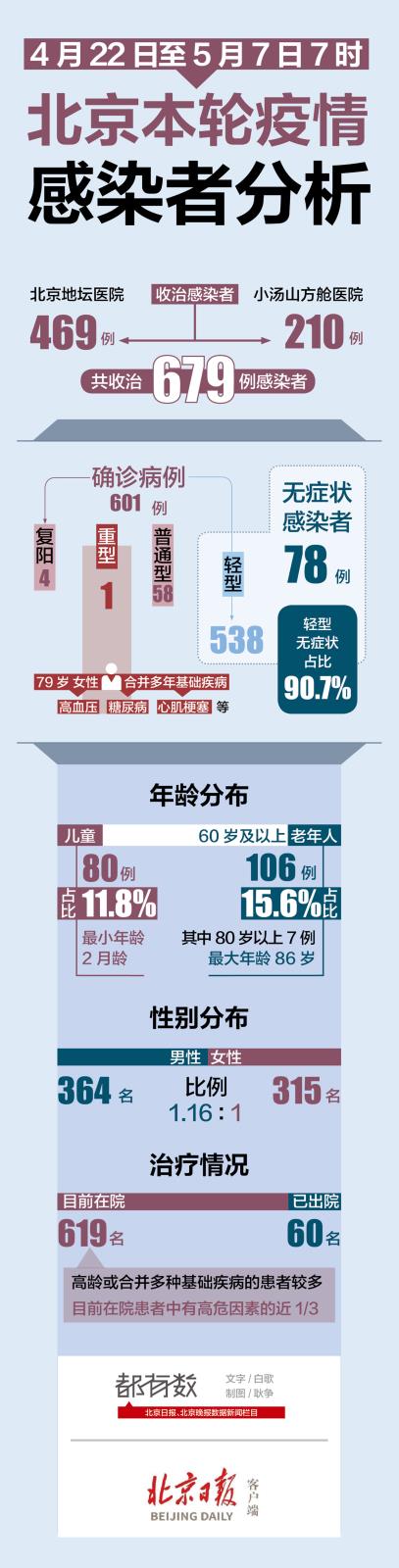 5月7日下午,北京市新冠肺炎疫情防控工作第327场新闻发布会披露了本轮疫情截至5月7日7时的感染者收治情况。重症有多少例?无症状和轻症占比多少?年龄分布有何特征?一图读懂——