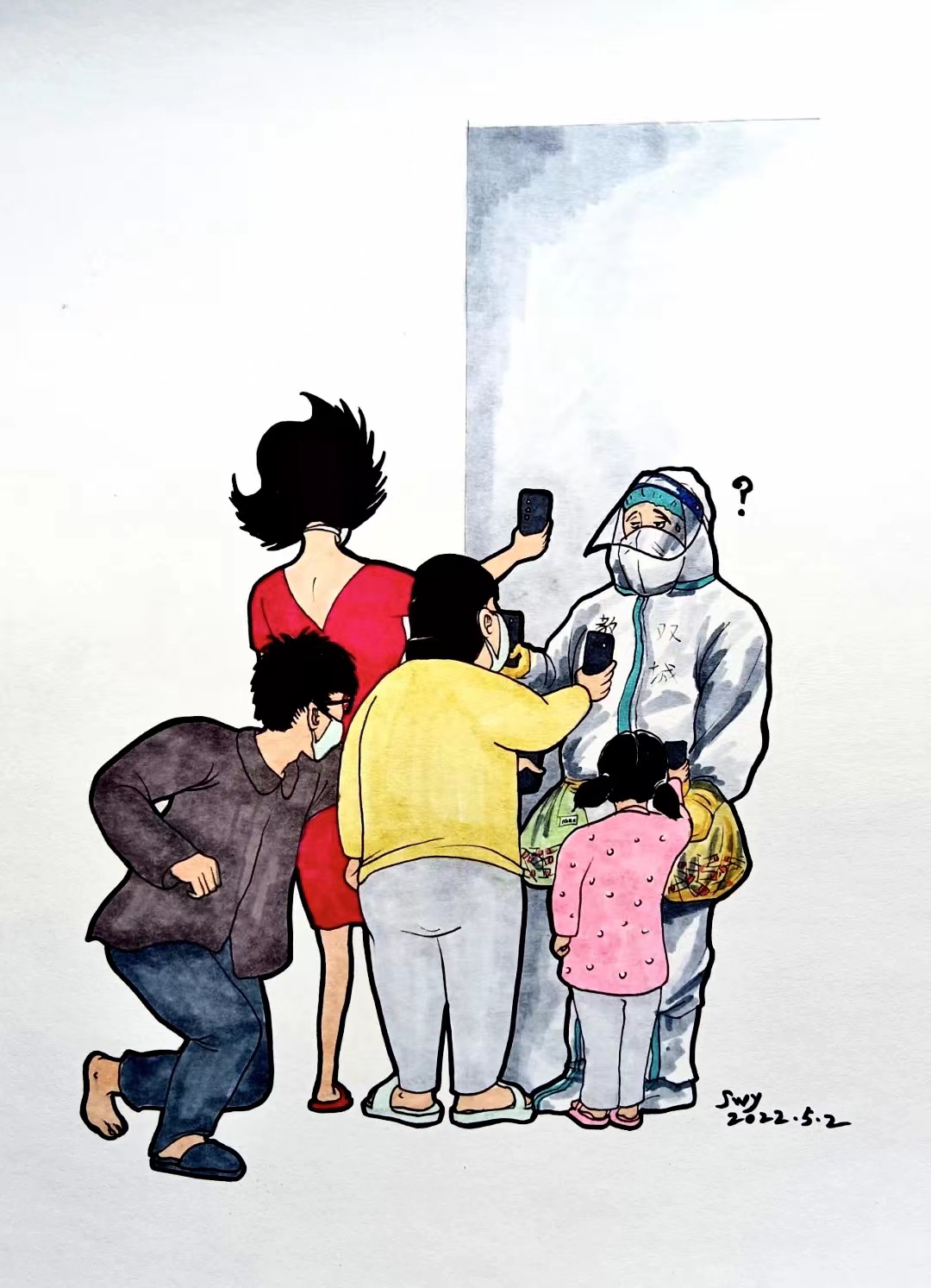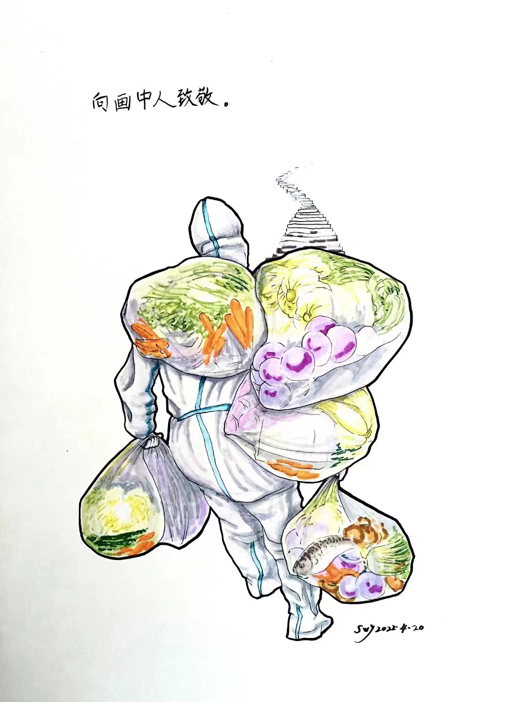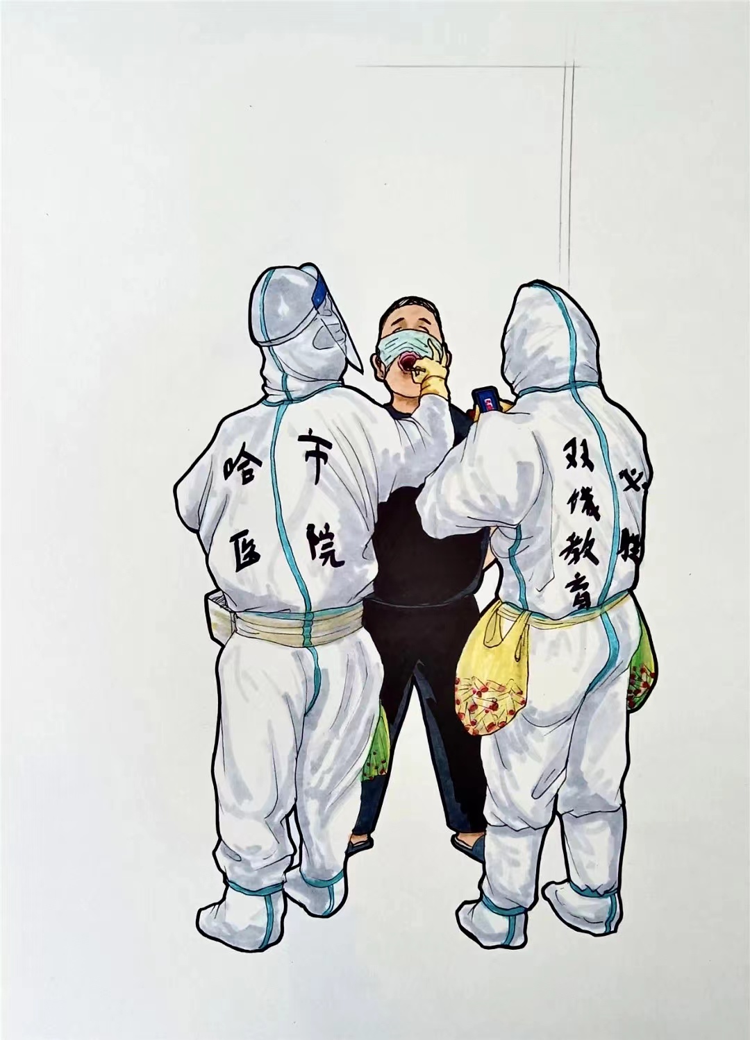 孙万岩与哈五院、哈红十字医院、哈一专的医护人员每天一起爬楼给居民做核酸采样,这幅画生动描绘了支援双城抗疫的全体哈尔滨市医护工作者和双城教育系统核酸采集辅助人员的日常工作。