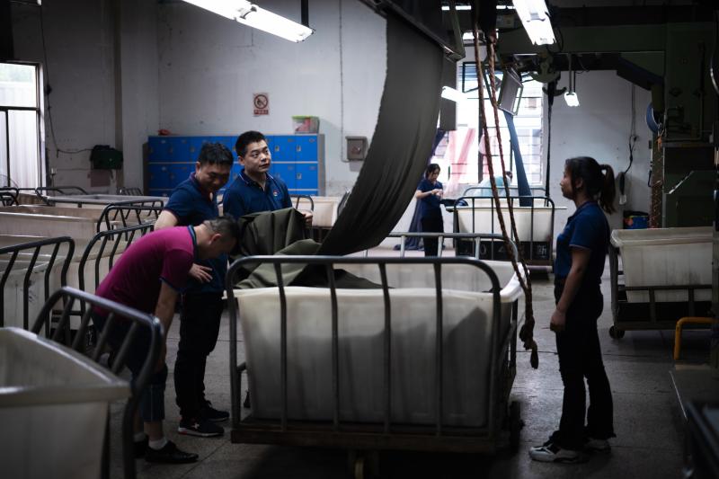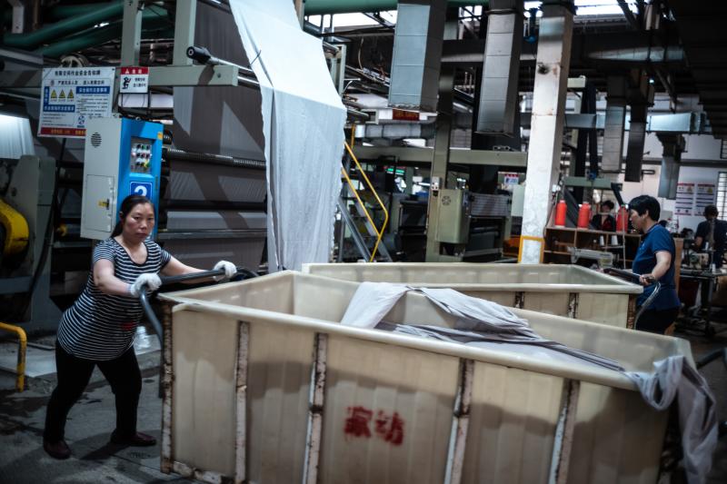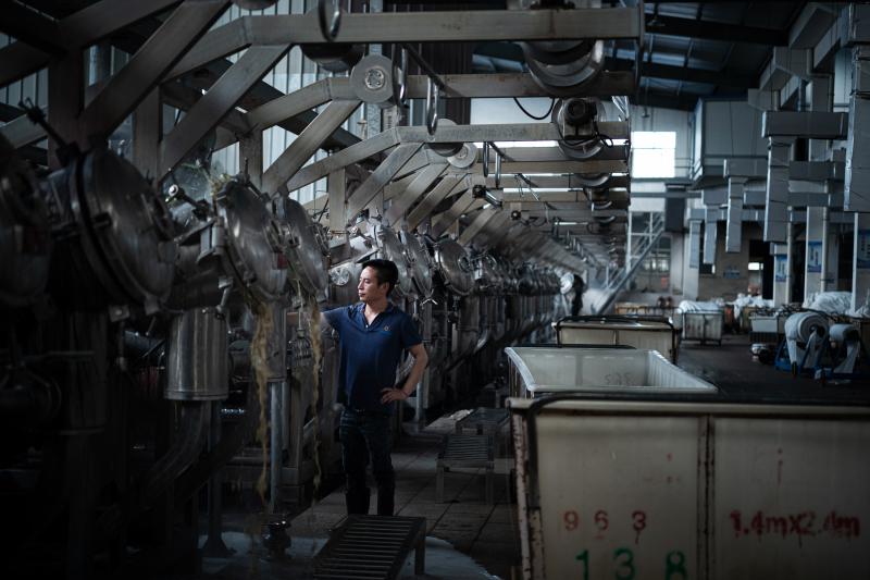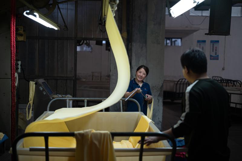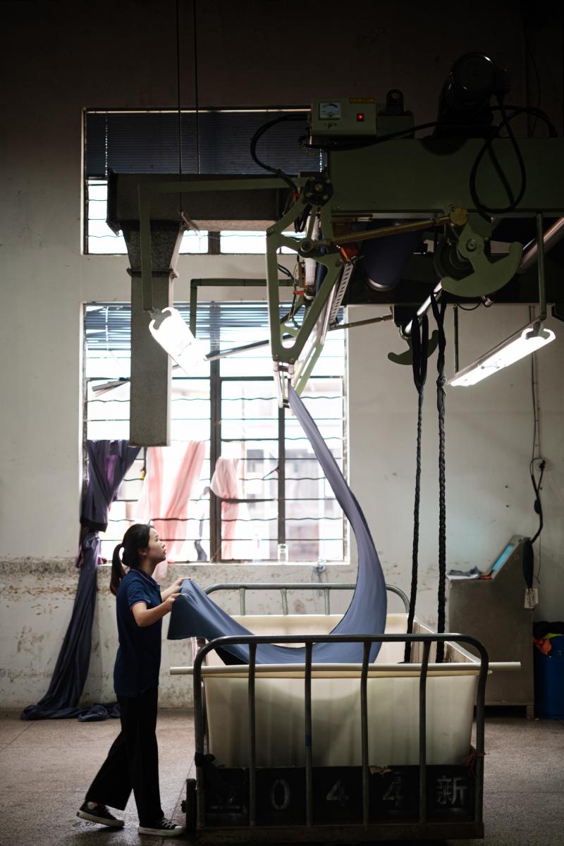 在位于盛泽镇的立新集团旗下的印染厂内,工人们正在忙碌地进行面料的生产工作。