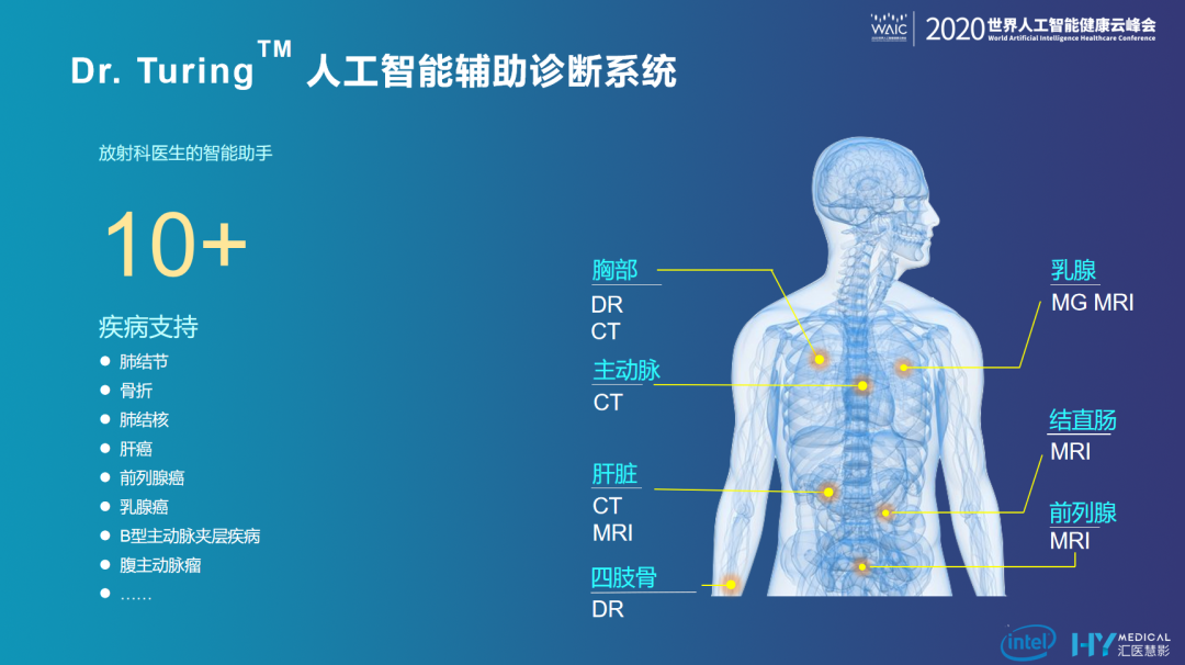 如何利用AI的方法进行一些疾病的识别、疾病的精准诊断,如何把诊断的结果融入到医生工作流程里,让整个工作流程变得结构化、智能化和高效化,都是汇医慧影正在解决的问题。目前汇医慧影已完成超过十个疾病的人工智能辅助诊断产品的研发与应用,涉及癌症、血管、骨科、流行病和传染病等几大方面。
