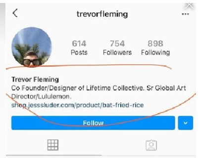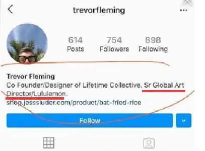 原来,就在那个美国设计师Jess Sluder在社交账号上推广这款涉嫌侮辱亚裔的衬衫时,他还@了Lululemon的全球艺术总监Trevor Fleming。而Fleming本人也在自己社交账号的简介中贴出了Sluder网店中“蝙蝠炒饭”这款衬衫的链接,似乎是在给他做推广。