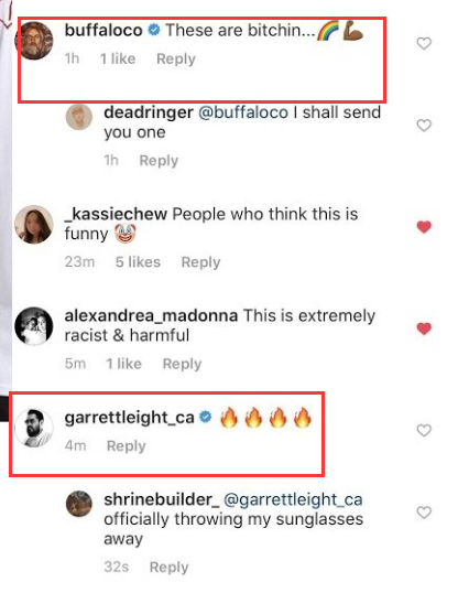 不过,这个Lululemon的艺术总监并不是唯一一个在参与推广这个衬衫的人。从NextShark给出的截图来看,美国太阳眼镜品牌Garrett Leight的创始人Garrett Leight,以及一个名叫White Buffalo的美国音乐人,都做出了疑似认可这款衬衫的表达。